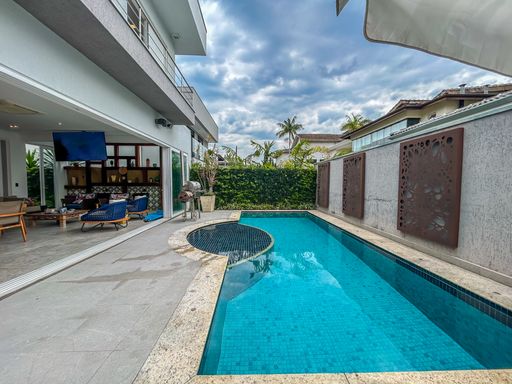 - 5 suítes (3 no térreo e 2 no piso superior), todas com ar-condicionado - Sala de jogos com brinquedoteca - Sala de TV - Sala de jantar - Sala de estar - Cozinha em conceito aberto, totalmente equipada - Lavanderia - Bicicletário com entrada independente - Lavabo externo - Espaço gourmet completo com churrasqueira, geladeira e chapa - Piscina - Lago - Ducha À Disponibilidade e Valores dos Imóveis anunciados podem sofrer alterações a qualquer momento, sem aviso prévio.