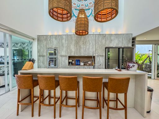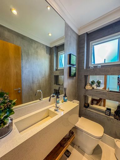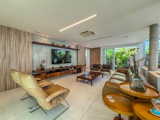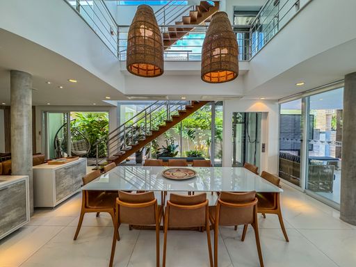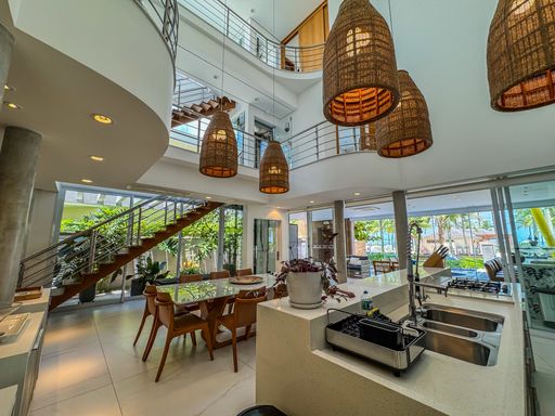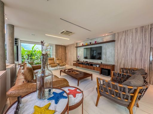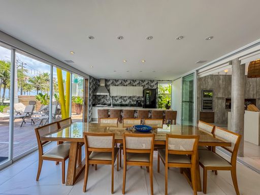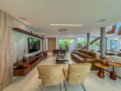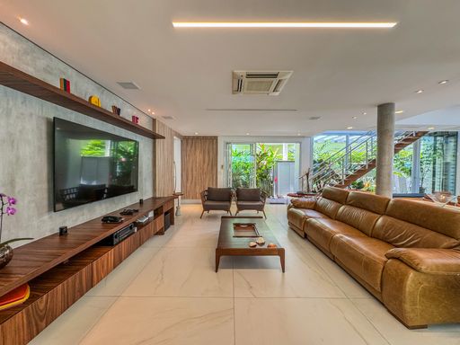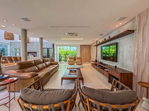 - Living integrado com três ambientes: sala de estar, sala de jantar e cozinha em conceito aberto
